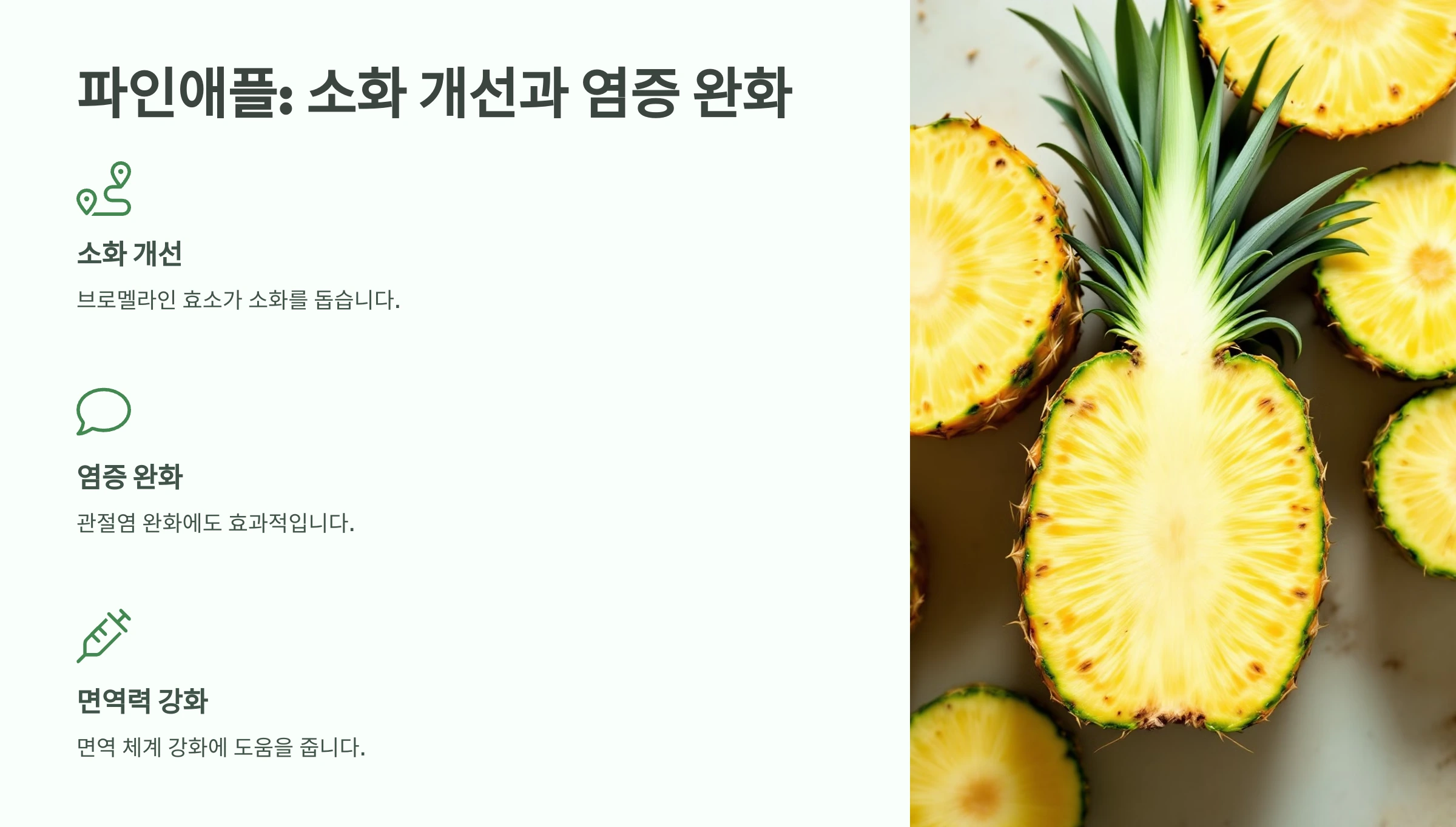 - 섭취 팁: 식후 디저트로 파인애플을 섭취하면 소화에 도움이 됩니다.