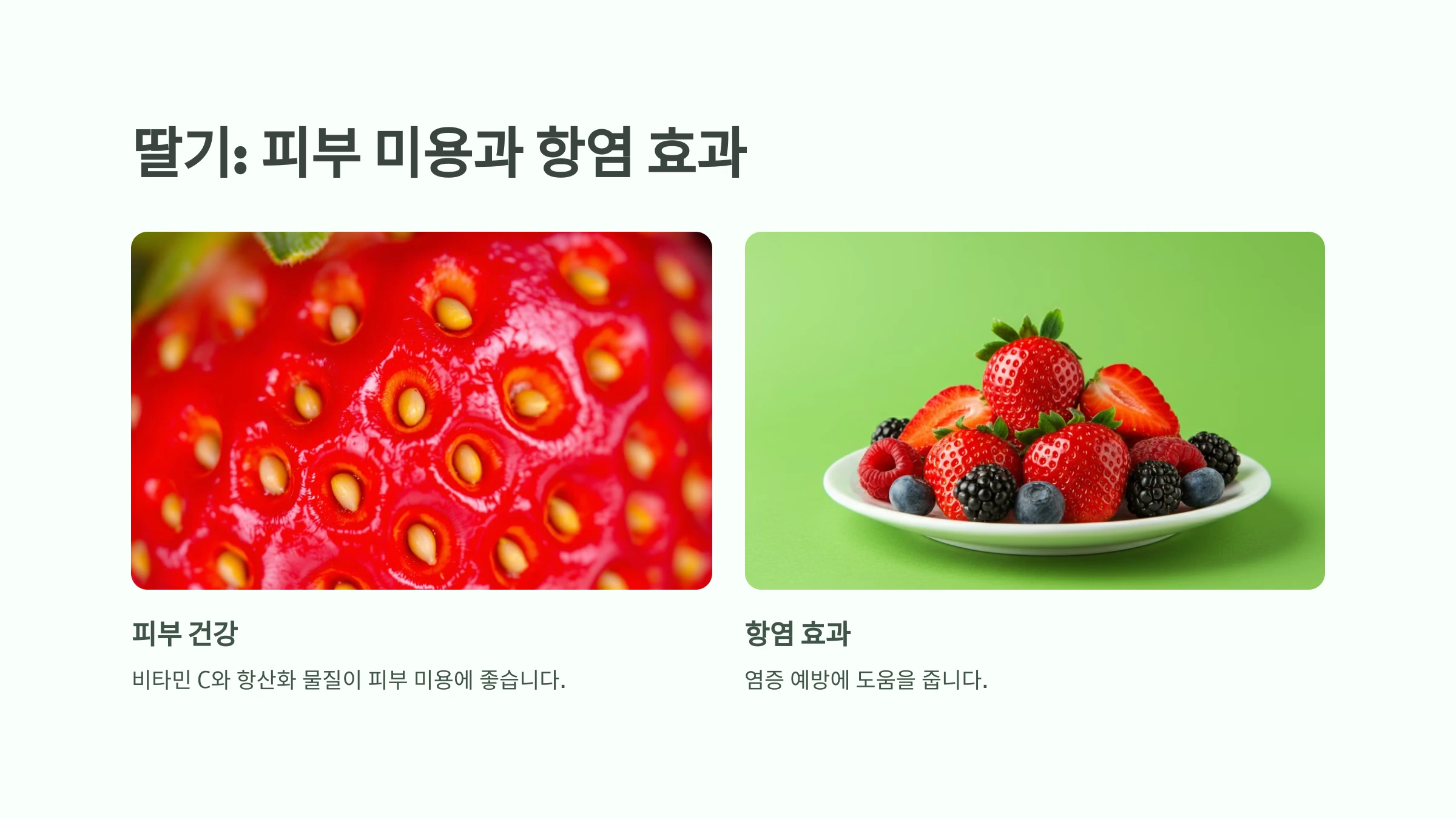 딸기는 비타민 C와 항산화 물질이 풍부해 피부 건강을 촉진하며, 항염 효과가 있어 염증을 예방합니다. 또한 딸기는 칼로리가 낮아 다이어트에도 적합한 과일입니다.