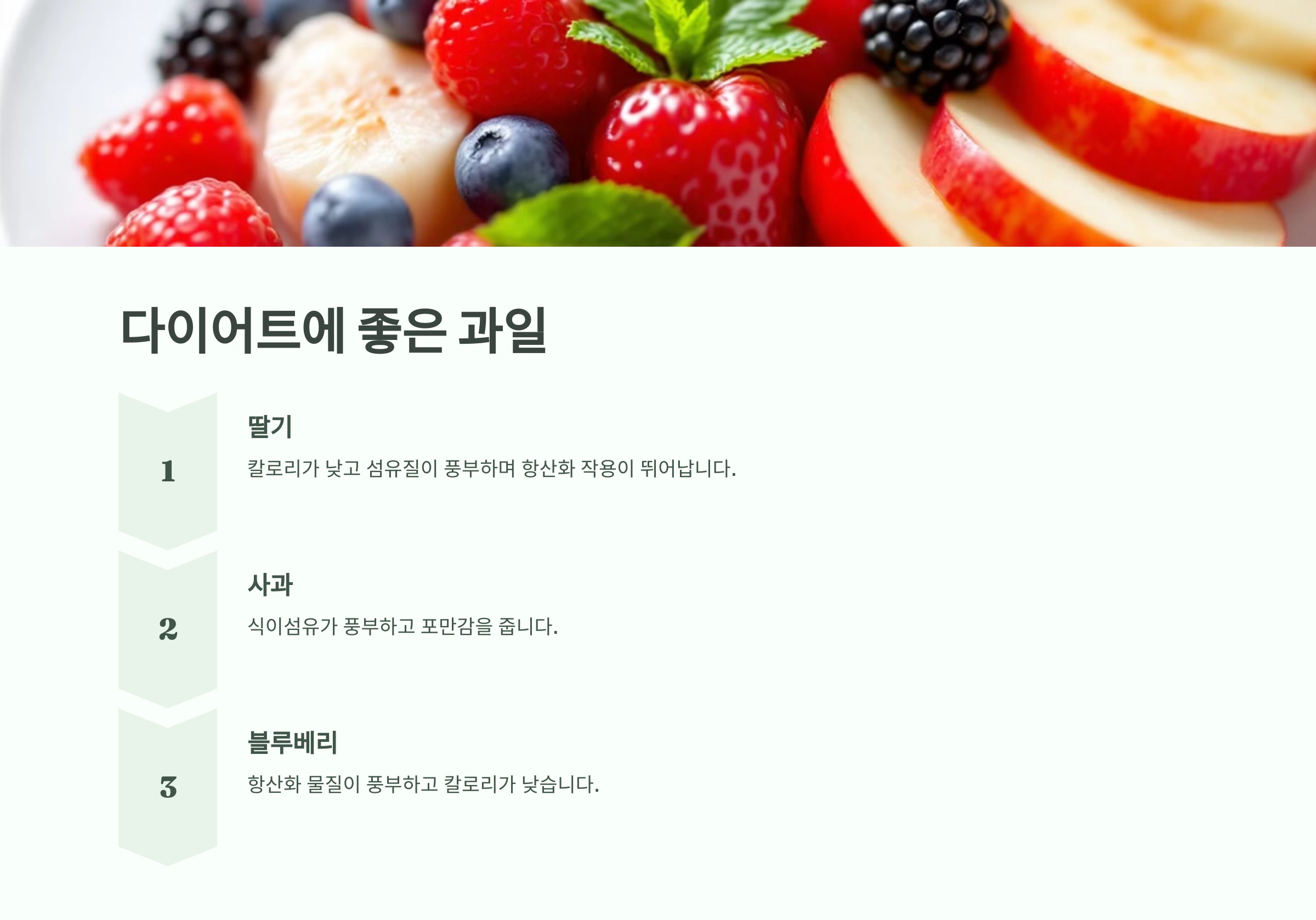 딸기, 사과, 블루베리와 같은 과일은 칼로리가 낮고 섬유질이 풍부해 다이어트에 효과적입니다. 특히 딸기는 항산화 작용도 뛰어나 피부 건강까지 챙길 수 있습니다.