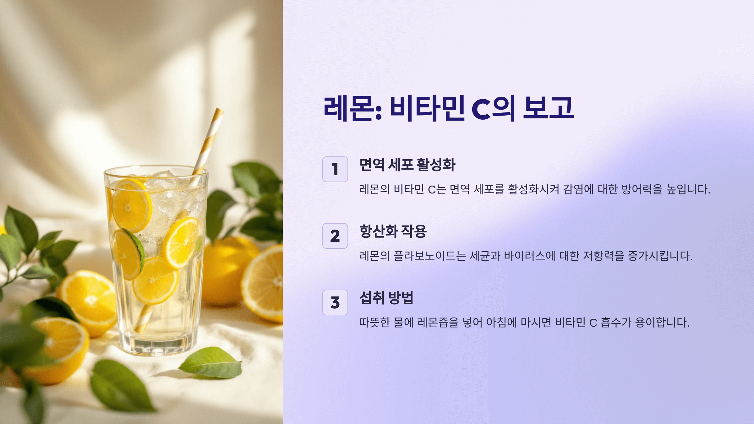 - 섭취법: 따뜻한 물에 신선한 레몬즙을 넣어 아침에 마시면 비타민 C 흡수가 더 용이합니다. 또한 샐러드 드레싱으로 활용해도 좋습니다.