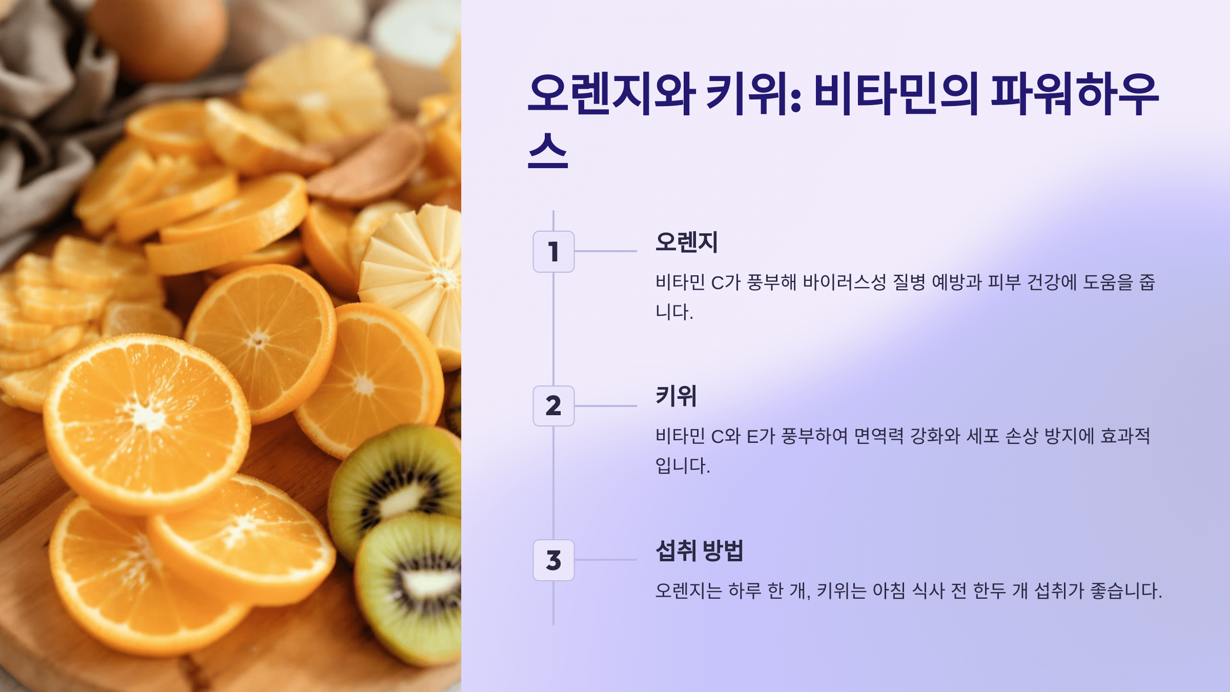 - 섭취법: 하루에 신선한 오렌지 한 개를 간식으로 섭취하는 것이 가장 좋습니다.