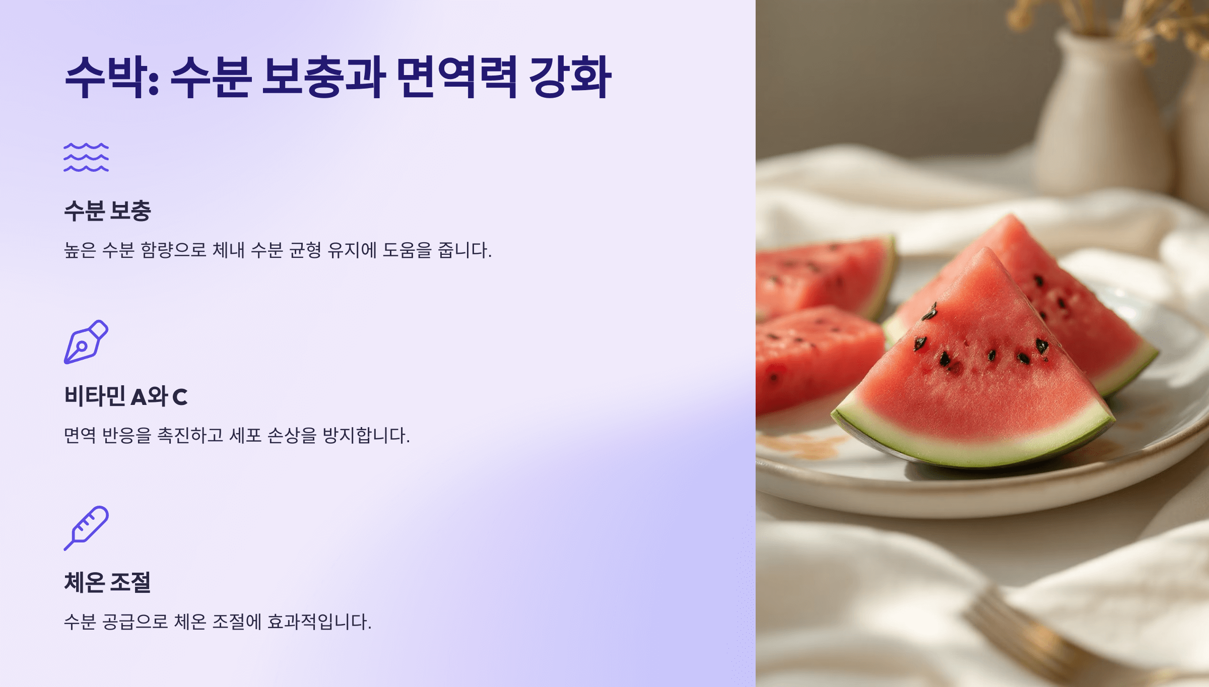 수박은 여름철 갈증 해소에 좋은 과일일 뿐 아니라 면역력 강화에도 큰 도움이 됩니다. 수박에는 비타민 A와 C가 다량 함유되어 있어 신체의 면역 반응을 촉진하며, 세포 손상을 방지해 감염에 강한 몸을 유지하게 합니다. 특히 수분 함량이 높아 체내 수분 균형을 유지하는 데도 효과적이어서, 탈수 방지와 함께 체온을 조절하는 데 도움이 됩니다.
