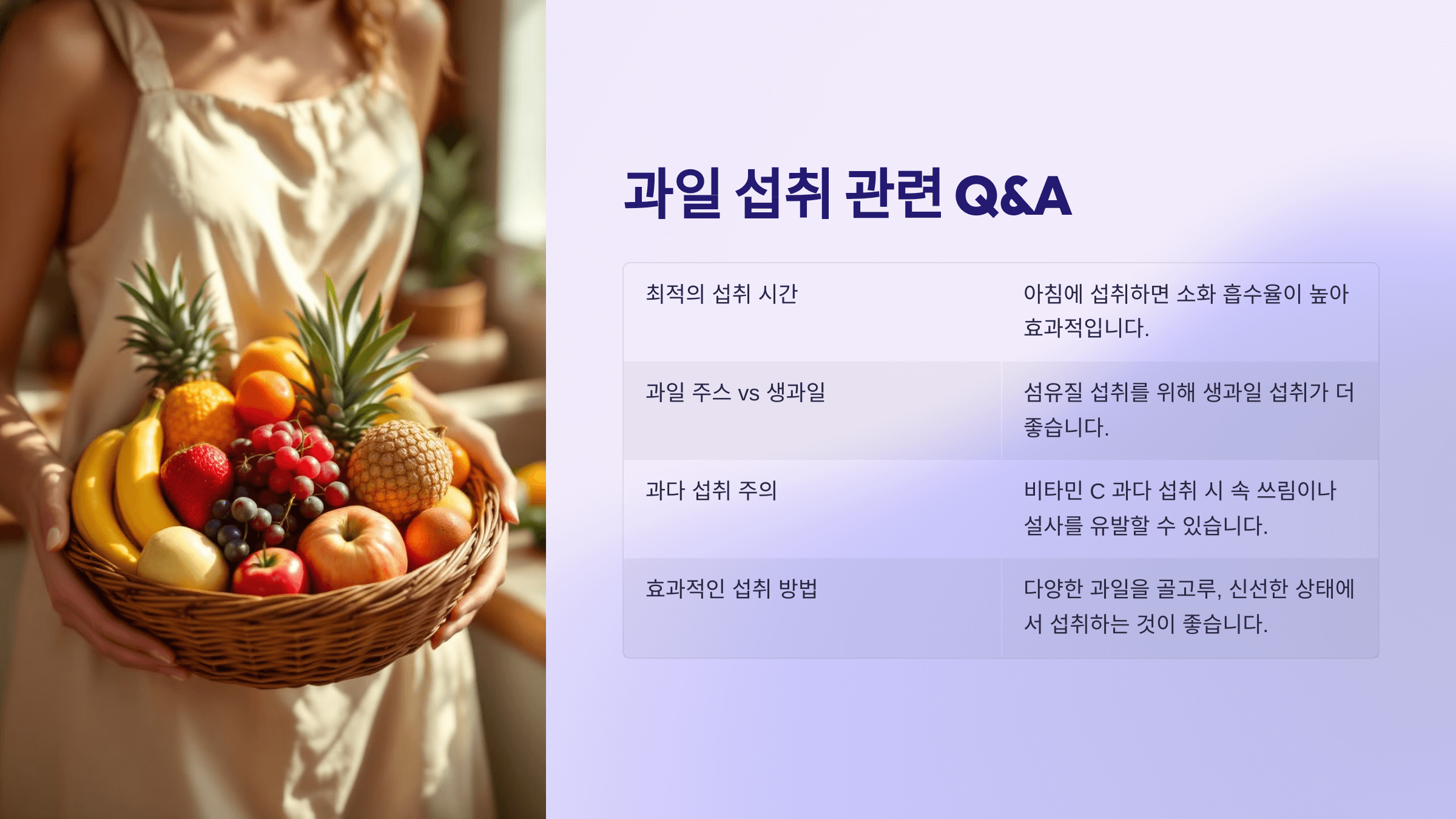 다양한 과일을 골고루 섭취하고, 신선한 상태에서 섭취하는 것이 좋습니다. 과일은 식사 후 바로 먹기보다 약간의 시간이 지난 후 섭취하는 것이 영양소 흡수에 유리합니다.