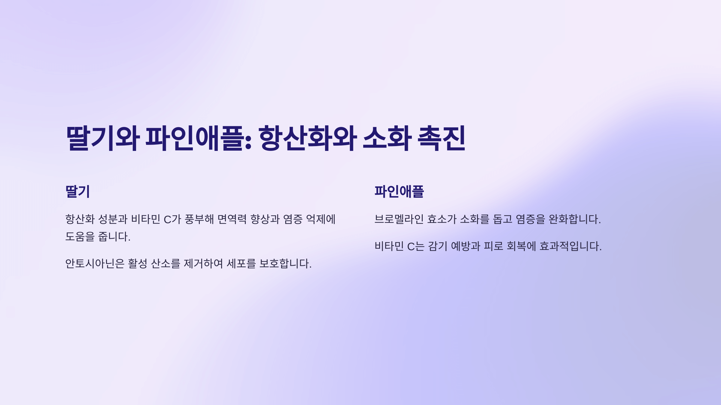 파인애플은 비타민 C와 브로멜라인이라는 효소가 풍부해 면역력 강화와 소화 기능 개선에 효과적인 과일입니다. 특히 브로멜라인은 단백질을 분해하여 소화를 돕는 동시에 염증을 완화하는 효능이 있어 소화기 건강에 좋습니다. 이와 함께 파인애플의 비타민 C 성분은 감기 예방과 피로 회복에도 유익하며, 면역 세포 활성화를 촉진해 바이러스와 세균으로부터 몸을 지킬 수 있게 합니다.