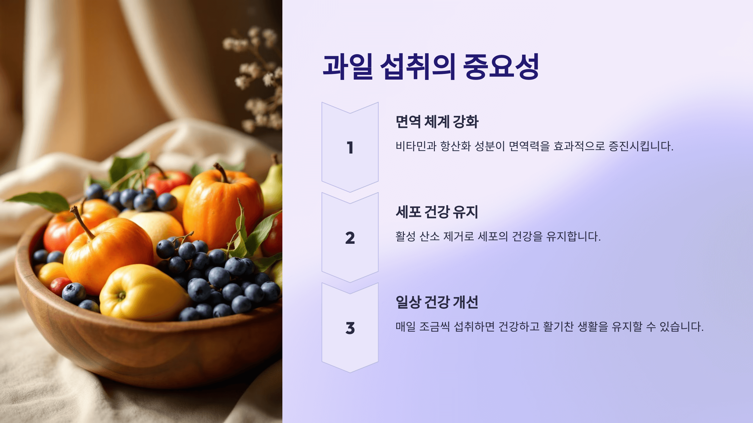 과일은 면역력 강화에 큰 도움을 주지만, 다양한 영양소 섭취와 충분한 수면, 꾸준한 운동이 함께 이루어져야 효과적입니다.
