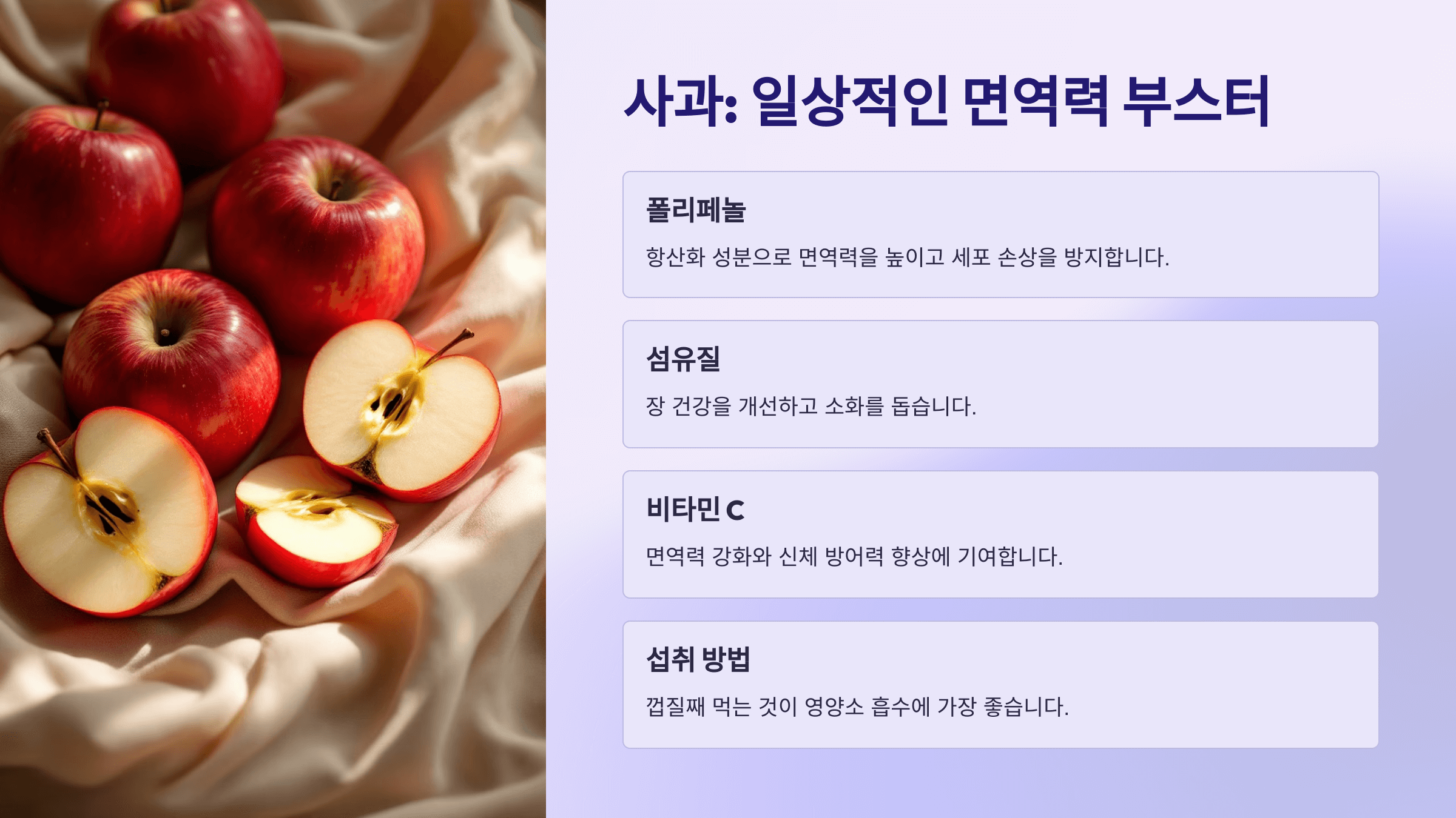 사과는 면역력을 높이는 폴리페놀과 비타민 C가 풍부해 일상적으로 섭취하기 좋은 과일입니다. 특히 사과에 함유된 섬유질은 장 건강을 개선하고 소화를 돕는 데 효과적이며, 장 건강이 면역력과 밀접한 관계가 있는 만큼 장 기능을 원활하게 유지해주는 것이 중요합니다. 또한, 사과에는 항산화 성분이 포함되어 있어 세포 손상을 방지하고 신체 방어력을 높여주는 역할을 합니다.